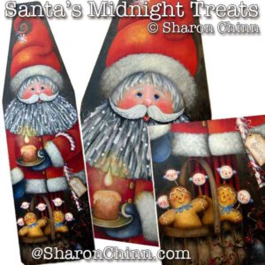 Santa’s Midnight Snacks Ironing Board or Pelt/Mink Board by Sharon Chinn Paint Santa with his basket of gingerbread and snowman lollipop treats on an ironing board or long sign board. Line drawing included for pelt board or full-sized vintage ironing board. This pattern is available for purchase in my Pattern…