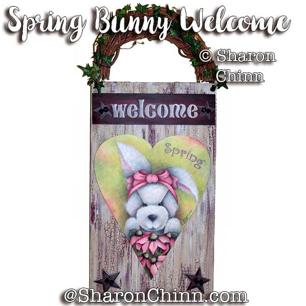 A pretty white bunny with a bright pink bow around her ears and she’s holding a bouquet of pink coneflowers. This design is painted in DecoArt Americana acrylics on a 9.5″x12″ heart. I’ve also included instructions to make and paint a signboard to display your hearts. Simply apply velcro to the signboard and heart and you can quickly interchange the hearts for different seasons and holidays.